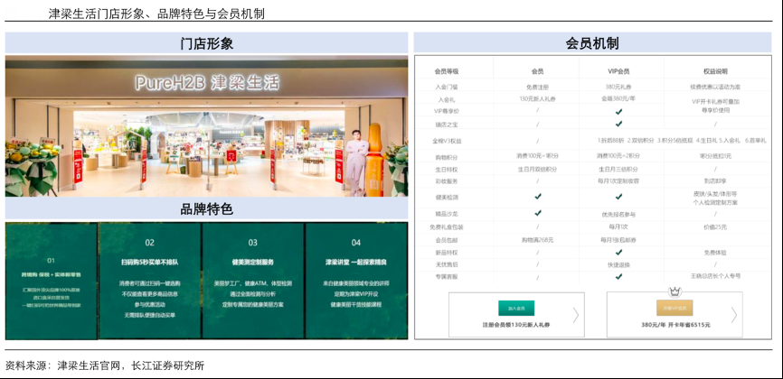 經(jīng)典案例:根據(jù)津梁生活官網(wǎng)、長江證券研究所等綜合資訊表明,津梁生活定位于健康生活平臺,致力打造線上線下統(tǒng)一運營的數(shù)字化門店,為消費者提供掃碼購、跨境購、健美測等特色項目。目前門店數(shù)為 8 家、SKU 為4200+,涵蓋美妝、香氛、洗護、食品、保健、家居、運動、茶飲等8大產(chǎn)品專區(qū),2020 實現(xiàn)收入 4000 萬元。商業(yè)模式以會員消費為主,以定制妝容、體型檢測等個性化服務(wù)增強會員粘性,通過大牌化妝品引流,自有品牌和獨家代理品牌提升利潤。
