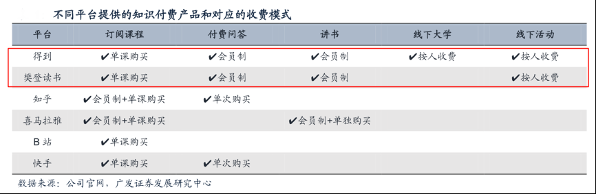 經(jīng)典案例:根據(jù)公司官網(wǎng)、廣發(fā)證券發(fā)展研究中心等綜合資訊表明,目前主流的知識(shí)付費(fèi)產(chǎn)品包括訂閱課程、講書(shū)、 付費(fèi)問(wèn)答、線下大學(xué)、線下活動(dòng)等。從付費(fèi)模式來(lái)看,輕度且標(biāo)準(zhǔn)化的講書(shū)產(chǎn)品以會(huì)員收費(fèi)為主,付費(fèi)問(wèn)答采用會(huì)員收費(fèi)或單次收費(fèi),訂閱課程以單課收費(fèi)為主,服務(wù)更深度的線下活動(dòng)和線下大學(xué)采用按人收費(fèi)的模式。