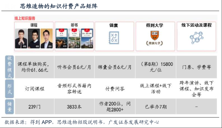 經(jīng)典案例:根據(jù)得到APP、思維造物招股說(shuō)明書(shū)、廣發(fā)證券發(fā)展研究中心等綜合資訊表明,思維造物提供的知識(shí)付費(fèi)產(chǎn)品主要包括訂閱課程、講書(shū)、付費(fèi)問(wèn)答、得到大學(xué)、線下活動(dòng)及課程這五種形式。訂閱課程的內(nèi)容涉及應(yīng)用技能類(lèi)、商學(xué)類(lèi)、科學(xué)類(lèi)和人文類(lèi),用戶(hù)通過(guò)訂閱課程付費(fèi),單個(gè)課程的售價(jià)在19.9-365元之間,期數(shù)在5-394 講不等,每講時(shí)長(zhǎng)一般在10-20分鐘。