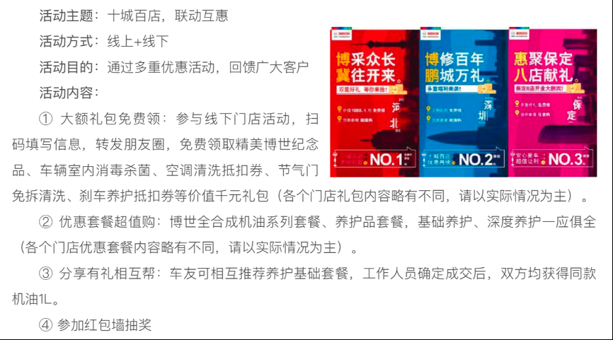 經(jīng)典案例:根據(jù)CCFA《2021CCFA生活服務(wù)行業(yè)優(yōu)秀實踐案例集》等綜合資訊表明,博世車聯(lián)在全國十個城市,百家門店進(jìn)行線上線下聯(lián)動,不僅為廣大車主提供多種超值優(yōu)惠活動和便捷的服務(wù),同時也為博世車聯(lián)的客戶調(diào)研提供素 材,從而不斷提升博世車聯(lián)的服務(wù)與產(chǎn)品技術(shù),做好品牌推廣,將百年的品質(zhì)與專業(yè)的維修服務(wù)帶到車主中間。