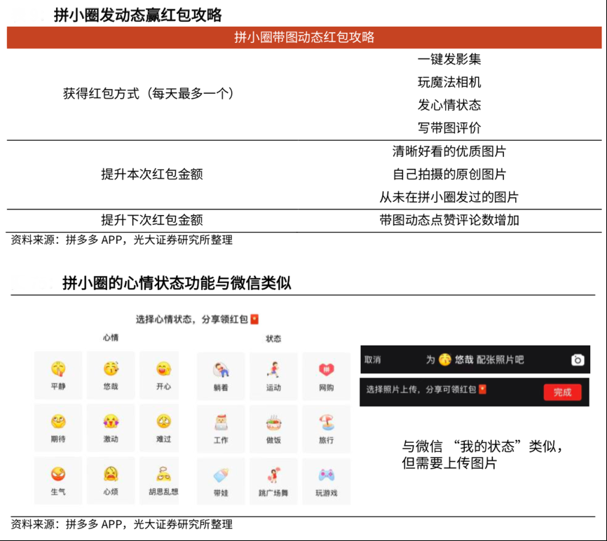 經(jīng)典案例:根據(jù)拼多多APP、光大證券研究所等綜合資訊表明,用戶通過拼小圈可以獲得帶圖動態(tài)紅包和帶貨紅包:1)帶圖動態(tài)紅包可以由一鍵發(fā)影集、玩魔法相機、發(fā)心情狀態(tài)、寫帶圖評價四種方式獲得,單用戶每天最多可得一個帶圖動態(tài)紅包。2)帶貨紅包主要由他人通過自身分享的購買鏈接購買同系列產(chǎn)品獲得。