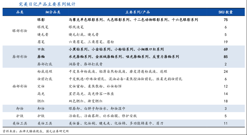 經(jīng)典案例:根據(jù)品牌天貓旗艦店、國元證券研究所等綜合資訊表明,截至 2020 年 9 月末,完美日記共有 SKU 1363 個,顯著多于傳統(tǒng)彩妝品牌。另外其從形成產(chǎn)品概念到產(chǎn)品上線時間可控制在 6 個月之內(nèi),在 2019 年、2020Q1-Q3 期間分別推出新 SKU 超過 800 個與 700 個,更新迭代速度業(yè)內(nèi)領(lǐng)先。產(chǎn)品分布方面,根據(jù)對完美日記天貓旗艦店產(chǎn)品的統(tǒng)計(jì),其擁有全系列彩妝產(chǎn)品,包括眼部、唇部、面部彩妝,以及卸妝、美妝工具等周邊產(chǎn)品,但多數(shù)SKU聚焦在色彩豐富度較高的眼部彩妝與唇部彩妝上。