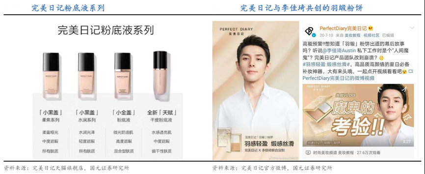 經(jīng)典案例:根據(jù)完美日記天貓旗艦店、完美日記官方微博、國元證券研究所等綜合資訊表明,完美日記自成立后陸續(xù)推出小黑蓋、小金蓋、天賦粉底液三款粉底,在定價上也逐漸升級,從初期注重性價比的小黑蓋(定價 59.9 元),逐漸升級為主打膚感、效果的天賦粉底液(定價 129.9 元)。2020 年 7 月品牌攜手 超頭主播李佳琦推出共創(chuàng)底妝產(chǎn)品羽緞粉餅,并將產(chǎn)品開發(fā)過程以視頻形式傳達(dá)給消費(fèi)者,借助專業(yè)美妝 KOL 的影響力與背書,提升品牌底妝產(chǎn)品在消費(fèi)者心中的專業(yè)度。
