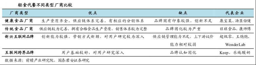 經(jīng)典案例:根據(jù)前瞻產(chǎn)業(yè)研究院、國泰君安證券研究等綜合資訊表明,從企業(yè)特征來看,代餐食品市場以四類廠商為主,包括康寶萊等健康食品廠商,旺旺、康師傅等傳統(tǒng)食品廠商,超級零、王飽飽等新興互聯(lián)網(wǎng)品牌,以及Keep、樂純等互聯(lián)網(wǎng)跨界品牌。其中,健康食品廠商與傳統(tǒng)食品廠商在生產(chǎn)加 工、線下渠道、供應(yīng)鏈管理等方面具有傳統(tǒng)優(yōu)勢;而新興互聯(lián)網(wǎng)品牌與跨界品牌則更擅長產(chǎn)品創(chuàng)新,在新營銷、新渠道方面更加迎合年輕用戶。