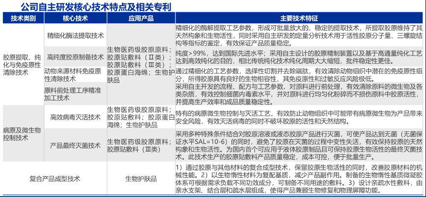 經(jīng)典案例:根據(jù)創(chuàng)爾生物招股書、申萬宏源研究等綜合資訊表明,創(chuàng)爾生物公司獨家運用技術(shù)包括高純度膠原制備技術(shù)、高效病毒滅活技術(shù)和產(chǎn)品最終滅菌技術(shù)。膠原提取過程中病毒滅活和免疫原性控制兩大行業(yè)技術(shù)痛點,同時取得了液態(tài)膠原在有效保持天然構(gòu)象和生物活性的前提下進行大規(guī)模無菌生產(chǎn)的技術(shù)突破。無菌活性膠原大規(guī)模提取制備技術(shù)的突破,極大提高了活性膠原的得率、質(zhì)量和生產(chǎn)規(guī)模,顯著降低了活性膠原的生產(chǎn)成本。