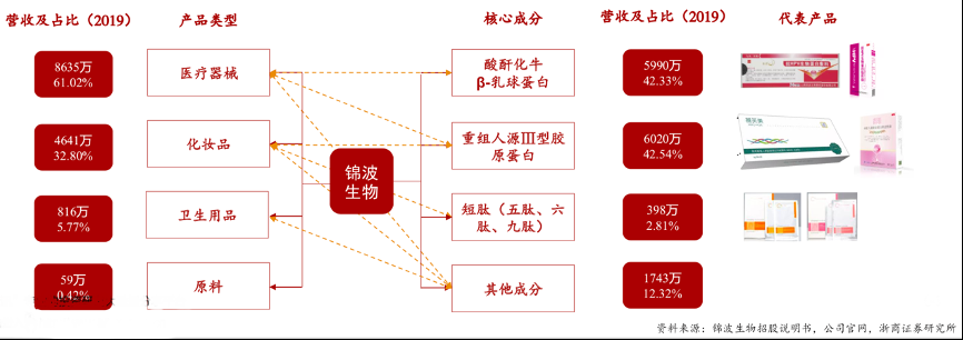 經(jīng)典案例:根據(jù)錦波生物招股說明書、公司官網(wǎng)、浙商證券研究所等綜合資訊表明,錦波生物創(chuàng)立于2008年,其作為抗病毒功能蛋白締造者+人源化新材料開拓者,建立從原料到醫(yī)療終端產(chǎn)品及功能性護(hù)膚品的全產(chǎn)業(yè)鏈業(yè)務(wù)體系。2019年,錦波生物實(shí)現(xiàn)原料收入59萬,營收占比0.42%,以原料為基礎(chǔ),醫(yī)療器械、化妝品、衛(wèi)生用品終端產(chǎn)品合計(jì)實(shí)現(xiàn)收入1.4億元,占比99.58%,其中醫(yī)療器械和化妝品貢獻(xiàn)主要營收。