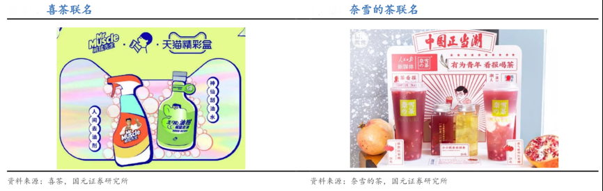 經(jīng)典案例:根據(jù)喜茶、奈雪的茶、國(guó)元證券研究所等綜合資訊表明,奈雪的茶曾與好歡螺、老佛爺、元?dú)馍?、德芙、旺旺等各個(gè)不同行業(yè)的品牌合作;喜茶曾與多芬、七喜、QQ 音樂(lè)跨界合作。除了在茶飲的合作以外,周邊產(chǎn)品 也常與品牌聯(lián)名或攜手知名設(shè)計(jì)師設(shè)計(jì)產(chǎn)品,如喜茶×Contigo 吸管杯、奈雪×拉脫維亞藝術(shù)家Roberts Rurans 牽手系列奈雪杯。