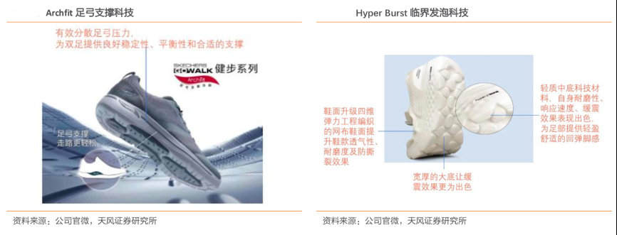 經(jīng)典案例:根據(jù)公司官微、天風(fēng)證券研究所等綜合資訊表明,斯凱奇致力于舒適科技的追求創(chuàng)新和升級(jí),其推出的GOWALK Arch Fit 系列首次使用了 Arch Fit 足弓支撐技術(shù),該技術(shù)由美國(guó)足部醫(yī)師在過(guò)去 20 年中通過(guò)對(duì) 12 萬(wàn)條足部掃描數(shù)據(jù)分析研究得出,能有效分散足弓壓力并且提供良好的穩(wěn)定性、平衡性和合適的支撐力。