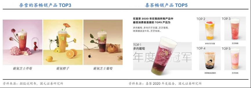 經(jīng)典案例:根據(jù)招股說明書、《喜茶2020年度報告》、國元證券研究所等綜合資訊表明,奈雪的茶飲產(chǎn)品包含25 款經(jīng)典茶飲+多款季節(jié)性茶飲,多數(shù)基于“鮮果+芝士+茶”模式,可分為果茶、鮮奶茶、純 茶 3 類。2020 年,喜茶前三大暢銷產(chǎn)品為多肉葡萄、多肉芒芒甘露以及芝芝草莓,其中多肉葡萄銷售額占比約為 18%。