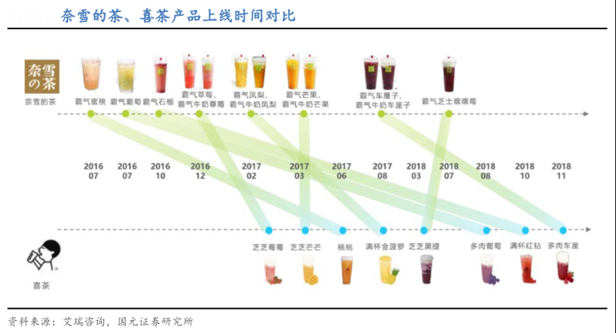 經(jīng)典案例:根據(jù)艾瑞咨詢、國元證券研究所等綜合資訊表明,新品周期上,奈雪平均 1 周推出一款新品,喜茶平均 1.2 周推出一款新品。喜茶和奈雪的茶推出的新品種類有所重疊,上線新品多與應(yīng)季鮮果有關(guān),大體上奈雪的茶相 比喜茶稍早推出類似新品。推新周期短維持品牌的高曝光度,保障對于消費者的持續(xù)吸引力,從而提升回購率和消費頻次。