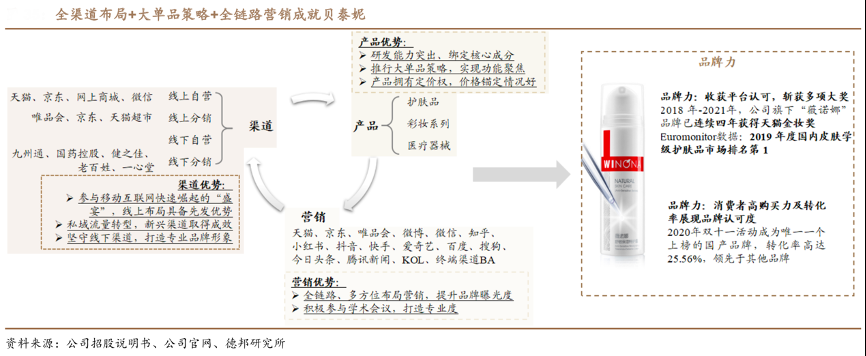 經(jīng)典案例:根據(jù)公司招股說明書、公司官網(wǎng)、德邦研究所等綜合資訊表明,貝泰妮成立時間晚于海外品牌,但2019 年貝泰妮市占率已達(dá)到 20.5%,位列國內(nèi)第一,全渠道布局、大單品策略和全鏈路營銷成就貝泰妮。