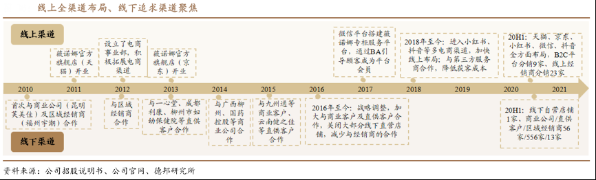 經(jīng)典案例:根據(jù)公司招股說明書、公司官網(wǎng)、德邦研究所等綜合資訊表明,2017年薇諾娜在微信平臺搭建“薇諾娜專柜服務(wù)平臺”,在行業(yè)中率先實(shí)現(xiàn)了線上和線下的相互滲透,通過派駐在終端網(wǎng)點(diǎn)的 BA 與客戶進(jìn)行溝通,后引導(dǎo)客戶加入會員,實(shí)現(xiàn)了以線下帶動線上的協(xié)同發(fā)展。