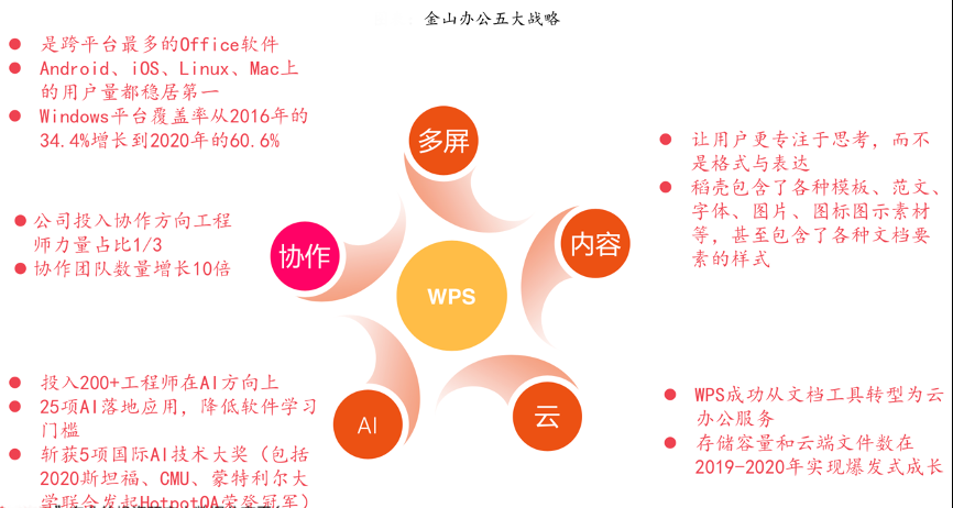 經(jīng)典案例:根據(jù)金山辦公公眾號、方正證券研究所等綜合資訊表明,2018年7月,金山辦公提出了“多屏、內(nèi)容、云、AI”辦公四大件,升級了新型智能辦公新形態(tài);2020年12 月,在WPS「CHAO」辦公大會上,金山辦公提出了全新戰(zhàn)略“協(xié)作”,并發(fā)布了金山表單、金山會議、金山 日歷、金山待辦和FlexPaper”5款全新的協(xié)作產(chǎn)品,同時發(fā)布OFD、金山海報2款辦公組件和1款內(nèi)容服務(wù)。