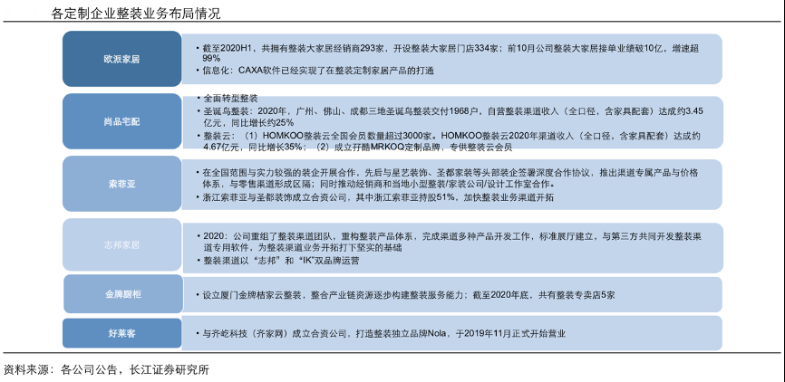 經(jīng)典案例:根據(jù)各公司公告、長(zhǎng)江證券研究所等綜合資訊表明,家居定制企業(yè)以合作、賦能兩種思路探索整裝業(yè)務(wù),合作在于渠道合作(引流)、供應(yīng)鏈的合作(如成立合資子公司等),賦能則在于品牌、信息化、供應(yīng)鏈 等方面(如整裝大家居、整裝云等模式)。
