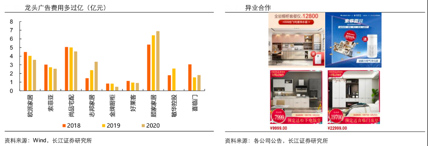 經(jīng)典案例:根據(jù)wind、各公司公告、長(zhǎng)江證券研究所等綜合資訊表明,全國(guó)性品牌企業(yè)在營(yíng)銷(xiāo)/渠道資源上更具備優(yōu)勢(shì),包括但不限于廣告投放(龍頭廣告投放多是億元級(jí)的)、頭部賣(mài)場(chǎng)的深度合作(與核心賣(mài)場(chǎng)如紅星美凱龍、居然之家以及部分強(qiáng)勢(shì)的區(qū)域賣(mài)場(chǎng)達(dá)成戰(zhàn)略合作)以及頭部品牌的異業(yè)合作等。