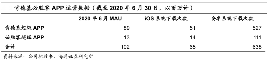 經(jīng)典案例:根據(jù)公司招股書(shū)、海通證券研究所等綜合資訊表明,肯德基與必勝客分別于 2015 年、2017 年推出各自超級(jí) APP,根據(jù)公司招股書(shū)援引沙利文報(bào)告,二者分別為中國(guó)首家推出超級(jí) APP 的快餐品牌和休閑餐飲品牌。截至 2019 年底,肯德基及必勝客的超級(jí) APP 是中國(guó)餐飲業(yè)下載次數(shù)最多的應(yīng)用程 序,iOS及安卓系統(tǒng)下載升級(jí)的次數(shù)約為第二名規(guī)模的三倍;并在同行內(nèi)擁有最高的月活躍用戶(hù)數(shù),約為排名第二的競(jìng)爭(zhēng)對(duì)手規(guī)模的三倍。