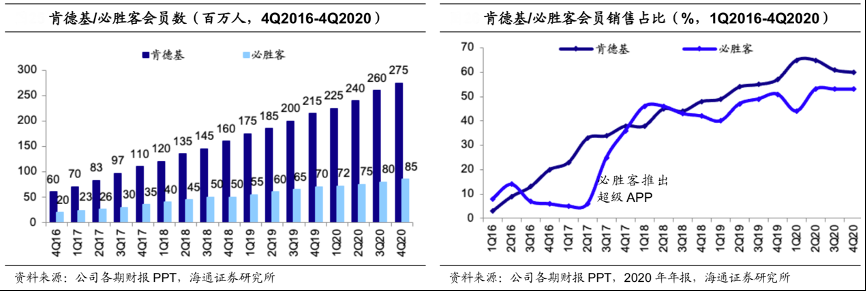 經(jīng)典案例:根據(jù)公司各期財(cái)報(bào)PPT、2020年年報(bào)、海通證券研究所等綜合資訊表明,截至 2020 年 12 月 31 日,肯德基及必勝客會(huì)員計(jì)劃分別有逾 2.75 億會(huì)員及逾 0.85 億會(huì)員。2020 年,肯德基會(huì)員銷(xiāo)售占比 62%,必勝客會(huì)員銷(xiāo)售占比 52%。重度會(huì)員往往會(huì)為公司貢獻(xiàn)額外收入,與 2016 年相比,2019 年每個(gè)活躍會(huì)員平均收入幾乎翻了一倍。此外,龐大的會(huì)員基數(shù)提供大量寶貴的顧客行為數(shù)據(jù),為其公司菜單創(chuàng)新和個(gè)性化增長(zhǎng)服務(wù)提供信息。