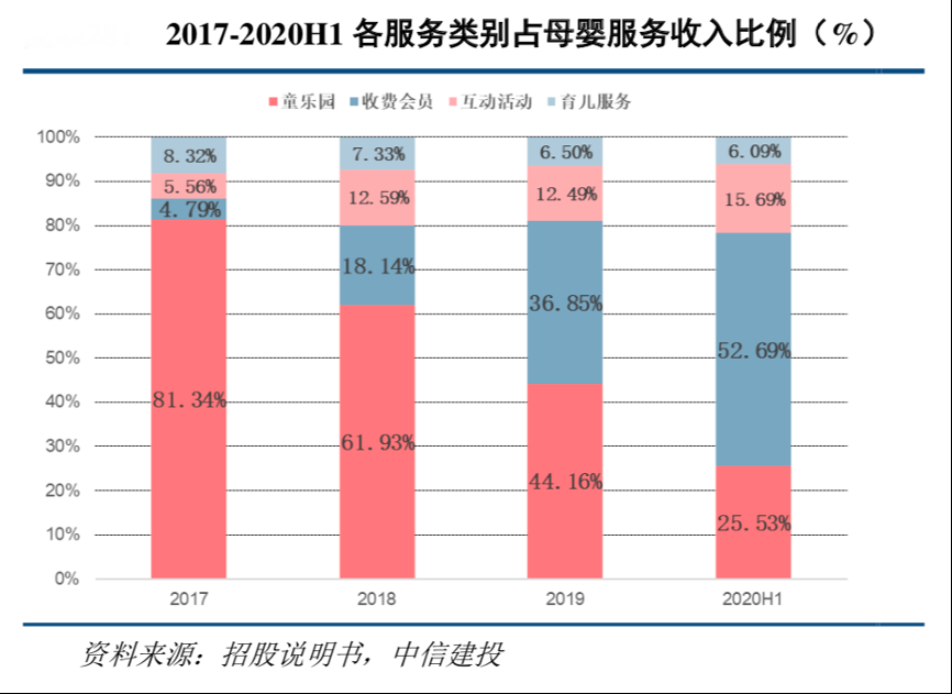 從收入占比來看,收費會員收入占比持續(xù)提升。2017-2020H1 童樂園收入占母嬰服務收入比例從 81.34%降 至25.43%,收費會員占比從 2017 年的 4.79%上升到 2020H1 的 52.69%?;踊顒诱急瘸掷m(xù)上升,從 2017 年的5.56%上升到 2020H1 的 15.69%。