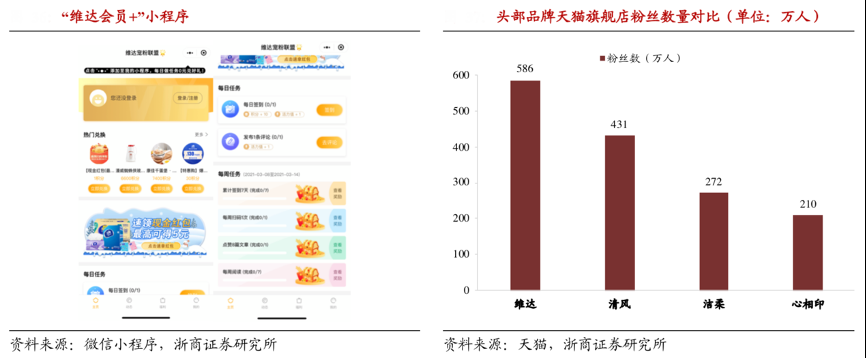 經(jīng)典案例:根據(jù)微信小程序、天貓、浙商證券研究所等綜合資訊表明,維達(dá)建立健全的會(huì)員機(jī)制吸引大量忠實(shí)粉絲,各大電商平臺(tái)均有針對粉絲的入會(huì)禮和積分激勵(lì)制度;2020年維達(dá)公司上線“維達(dá)會(huì)員+”小程序,以做任務(wù)兌換積分等形式加強(qiáng)了會(huì)員粘性。當(dāng)前維達(dá)粉絲數(shù)量遠(yuǎn)高于同行,以天貓旗艦店為例,維達(dá)、清風(fēng)、潔柔、心相印官方旗艦店粉絲數(shù)量分別為 586、431、272、210 萬。