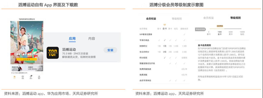 經(jīng)典案例:根據(jù)滔搏運(yùn)動(dòng)app、華為應(yīng)用市場、天風(fēng)證券研究所等綜合資訊表明,滔搏公司于 2020 年 2 月上線“滔搏運(yùn)動(dòng)”自有 APP,一年內(nèi)累計(jì)用戶規(guī)模突破 270 萬 人,APP 集內(nèi)容營銷、線上購物、會(huì)員服務(wù)等功能于一體。為優(yōu)化會(huì)員管理,滔搏會(huì)員系統(tǒng)采用分級(jí)積分制度,以現(xiàn)金折扣及關(guān)聯(lián)服務(wù)回饋公司會(huì)員,積累獎(jiǎng)勵(lì)、福利項(xiàng)目逐級(jí)提升,分級(jí)會(huì)員系統(tǒng)為公司終端同店季度銷售占比已經(jīng)達(dá)到 95% 以上,會(huì)員消費(fèi)成為其門店銷售絕對主力。