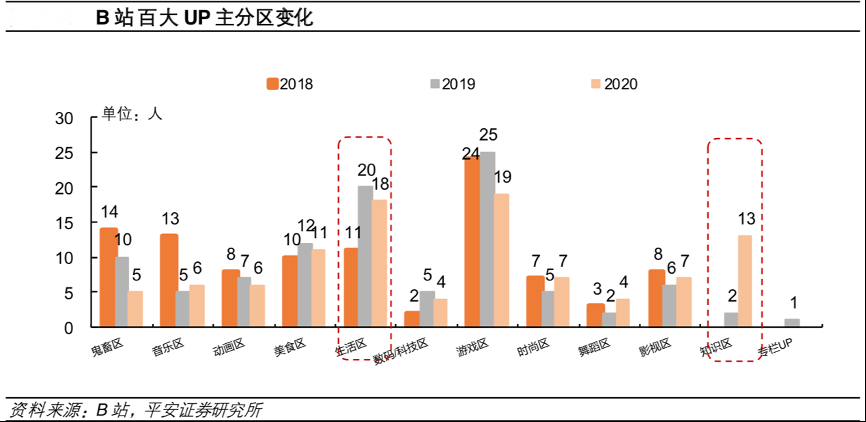 經(jīng)典案例:根據(jù)B站、平安證券研究所等綜合資訊表明,2018-2020,百大UP 主中,B 站傳統(tǒng) ACG 內(nèi)容鬼畜、音樂、動畫占比均有所下滑,而生活、知識類 UP 主進入百大數(shù)量大幅提升,生活區(qū)百大 UP 主數(shù)量從 2018 年的11 位提升至 2019 年 20 位,知識區(qū)百大 UP 主數(shù)量 從 2019 年的 2 位提升至 2019 年 13 位。