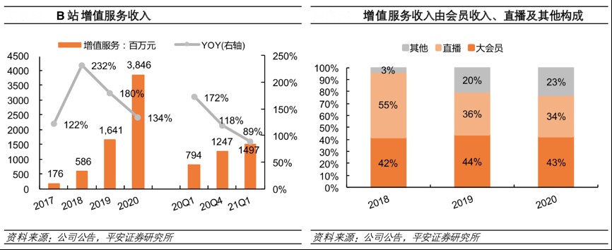 經(jīng)典案例:根據(jù)公司公告、平安證券研究所等綜合資訊表明,B站付費會員收入推動增值服務高速增長,2020年其增值服務收入達到 38.5 億元,同比增長 134%。增值服務收入包括付費會員、直播、動漫及其他,2020 年占比分比為 43%、34%、23%。截止2021Q1,付費會員(主要特權是能看優(yōu)質(zhì)的 OGC 視頻)規(guī)模達到 1610 萬,同比增長48%,占月活用戶比例達到 7.2%,付費會員規(guī)模推動付費會員收入大幅增長。