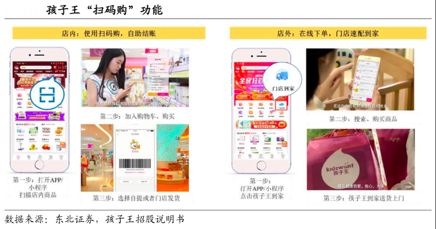 經典案例:根據(jù)東北證券、孩子王招股說明書等綜合資訊表明,孩子王公司于 2017年初推出“掃碼購”,之后 整合微信小程序、微信支付、掃一掃等產品功能,當顧客在門店購物時,僅需使用孩子王 APP 或小程序掃描商品條形碼,就可實時查看商品信息及以往消費者評價等;成功下單后即可自助結賬,還推出了“店外掃碼購”業(yè)務,在原有基礎上進行升級,消費者在孩子王 APP 選定門店后訂購商品或在店外可直接掃描商品條形碼下單,并由就近門店直接配送到家,真正實現(xiàn)了 7×24h 的無界購物體驗。