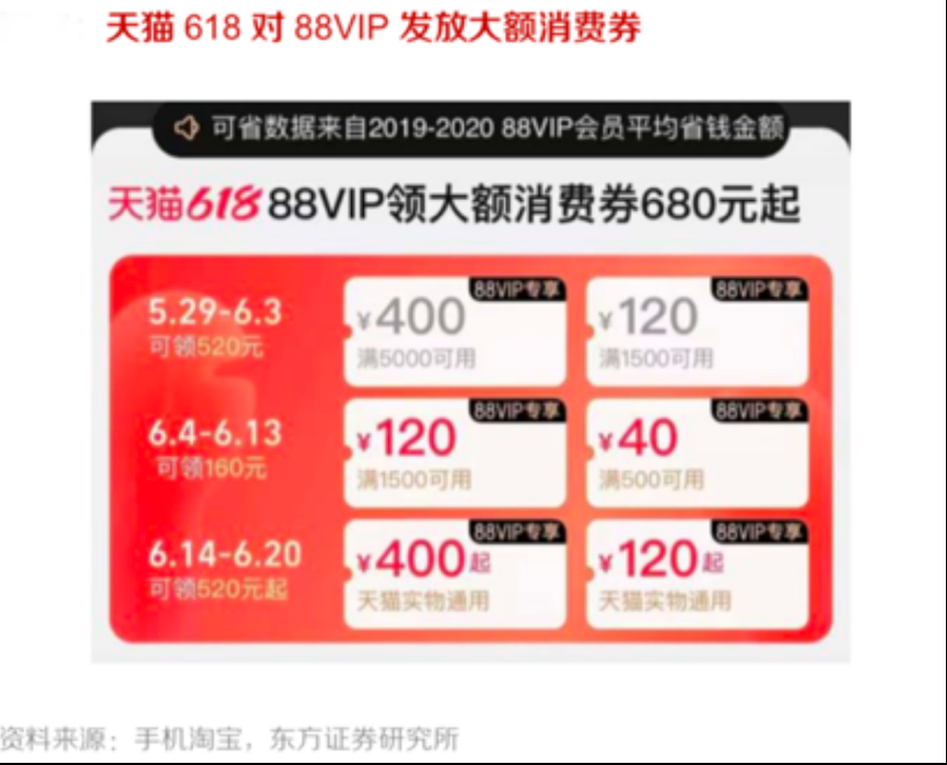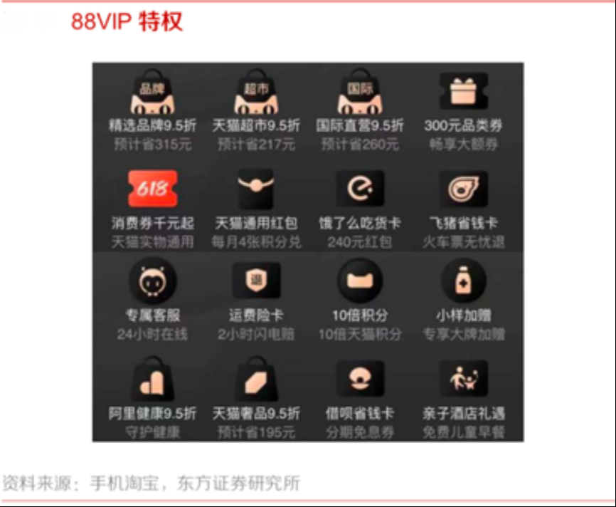 經(jīng)典案例:根據(jù)手機(jī)淘寶、東方證券研究所等綜合資訊表明,阿里88VIP 目前已經(jīng)擁有 16 項日常權(quán)益, 在 2021 年的 618 期間,天貓進(jìn)一步推出針對 88VIP 用戶的“滿 500 減 40”、“滿 1500 減 120” 的消費券,更有會員答謝禮、超值小樣、會員專供款、會員優(yōu)先購等多種形式吸引會員購買。目前,在天貓上已有 20 家品牌商的會員數(shù)超 1000 萬,而百萬級、十萬級會員數(shù)的品牌商,數(shù)量達(dá)到數(shù)萬個。
