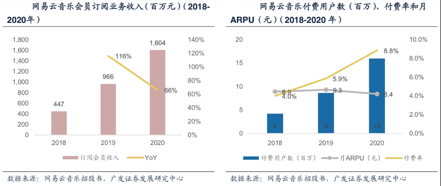 經(jīng)典案例:根據(jù)網(wǎng)易云音樂招股書、廣發(fā)證券發(fā)展研究中心等綜合資訊表明,網(wǎng)易云音樂的音樂會員收入在2020年達(dá)到16億元,月均會員對應(yīng)月活躍用戶的付費(fèi)率為8.8%,會員數(shù)同比增長 85%,會員月ARPU為8.4元,同比下滑10%。其中2020年會員訂閱收入對整體在線音樂的收入貢獻(xiàn)逐步提速至61%。該比例在 2018、2019年分別為44%和54%。