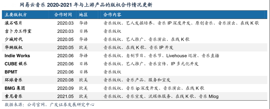 經(jīng)典案例:根據(jù)公司官網(wǎng)、廣發(fā)證券發(fā)展研究中心等綜合資訊表明,網(wǎng)易云音樂隨著TME對三大獨(dú)家代理版權(quán)的逐步解綁,網(wǎng)易云音樂從2020年開始陸續(xù)直接跟華納音樂、環(huán)球音樂獲取版權(quán)。2021年5月,網(wǎng)易云音樂和索尼音樂直接達(dá)成版權(quán) 合作,標(biāo)志著三大唱片過去和TME的獨(dú)家代理模式成為歷史。