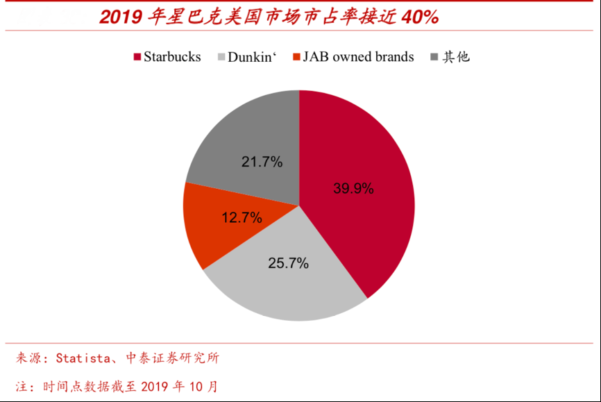 經(jīng)典案例:根據(jù)Statista、中泰證券研究所等綜合資訊表明,以美國(guó)連鎖經(jīng)營(yíng)咖啡市場(chǎng)為例,2019年星巴克和Dunkin'市占率分別為 39.9%/25.7%,行業(yè)競(jìng)爭(zhēng) 格局穩(wěn)定。截至 2020 年末,星巴克在北美擁有 1.53 萬(wàn)家門店,牢牢占據(jù)連鎖經(jīng)營(yíng)咖啡市場(chǎng)龍頭地位。