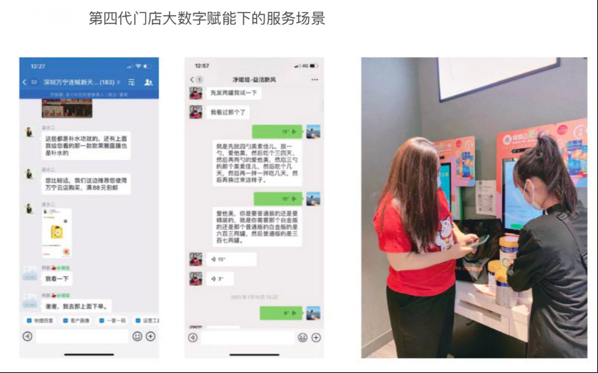 經(jīng)典案例:根據(jù)CCFA《2021CCFA生活服務(wù)行業(yè)優(yōu)秀實(shí)踐案例集》等綜合資訊表明,萬(wàn)寧店鋪已全面運(yùn)用微信導(dǎo)購(gòu)系統(tǒng),通過(guò)系統(tǒng)可以生成員工的專(zhuān)屬名片,通過(guò)企業(yè)背書(shū)增強(qiáng)顧客對(duì)員工的信任感。員工通過(guò)和顧客建立綁定關(guān)系,增加與顧客交流互動(dòng)機(jī)會(huì),成為顧客的私人顧問(wèn)。作為私人顧問(wèn),員工導(dǎo)購(gòu)可以進(jìn)行會(huì)員管理,通過(guò)查看會(huì)員資料,包括:最近瀏覽記錄,會(huì)員名下 優(yōu)惠券、積分、累計(jì)消費(fèi)、客單價(jià)、會(huì)員生日等信息,了解顧客喜好。在此基礎(chǔ)上,在線(xiàn)下,員工手持手機(jī)看板可以借助導(dǎo)購(gòu)功能服務(wù)顧客,運(yùn)用商品與服務(wù)知識(shí)陪同購(gòu)物。