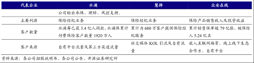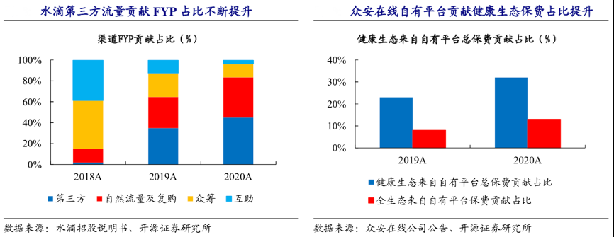經(jīng)典案例:根據(jù)水滴招股說明書、眾安在線公司公告、開源證券研究所等綜合資訊表明,水滴最初通過自營水滴籌、水滴互助引流至其水滴保平臺,水滴籌裂變式宣傳效果驚人,其已吸引超 3.4 億人捐款,并于近年加強第三方渠道流量建設,其貢獻 FYP 占比自 2018 年的 1.9%提升 43pct 至 2020 年的 44.9%。眾安在線則于起步之初將自身保險產(chǎn)品嵌入互聯(lián)網(wǎng)場景中,累計為超 5.24 億名客戶提供保障,且眾安在線通過品牌營銷、建設自營平臺,嘗試將自身打造為流量入口,其自營平臺健康生態(tài)保費收入占比 2020 為 32%,較 2019 年提升 9pct。