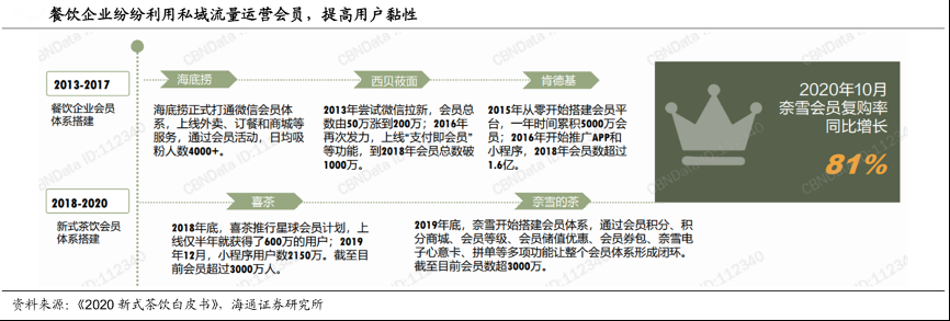 經(jīng)典案例:根據(jù)《2020新式茶飲白皮書》、海通證券研究所等綜合資訊表明,越來越多的新式茶飲企業(yè)、餐飲企業(yè)通過小程序、APP、天貓、微商城、社群、官方媒體矩陣等流量入口構(gòu)建品牌流量池,打造高效的線上營銷工具,提供更多功能如預(yù)點單、積分換禮品、專屬評價渠道,更好匯聚消費者數(shù)據(jù)及意見。