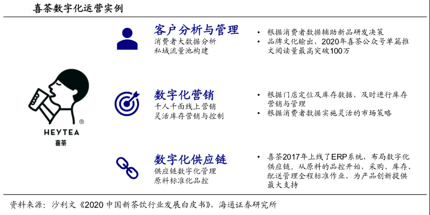 經(jīng)典案例:根據(jù)沙利文《2020 中國新茶飲行業(yè)發(fā)展白皮書》、海通證券研究所等綜合資訊表明,除了喜茶 GO 小程序,喜茶在數(shù)字化運營上也進行了更多的探索,其根據(jù)門店定位及庫存數(shù)據(jù),及時進行庫存營銷與管理,并根據(jù)消費者數(shù)據(jù)實施靈活的市場策略;2017年喜茶上線 ERP 系統(tǒng),布局?jǐn)?shù)字化供應(yīng)鏈。從原料的品控開始,采購、庫存、配 送管理全程標(biāo)準(zhǔn)作業(yè),為產(chǎn)品創(chuàng)新提供最大支持。