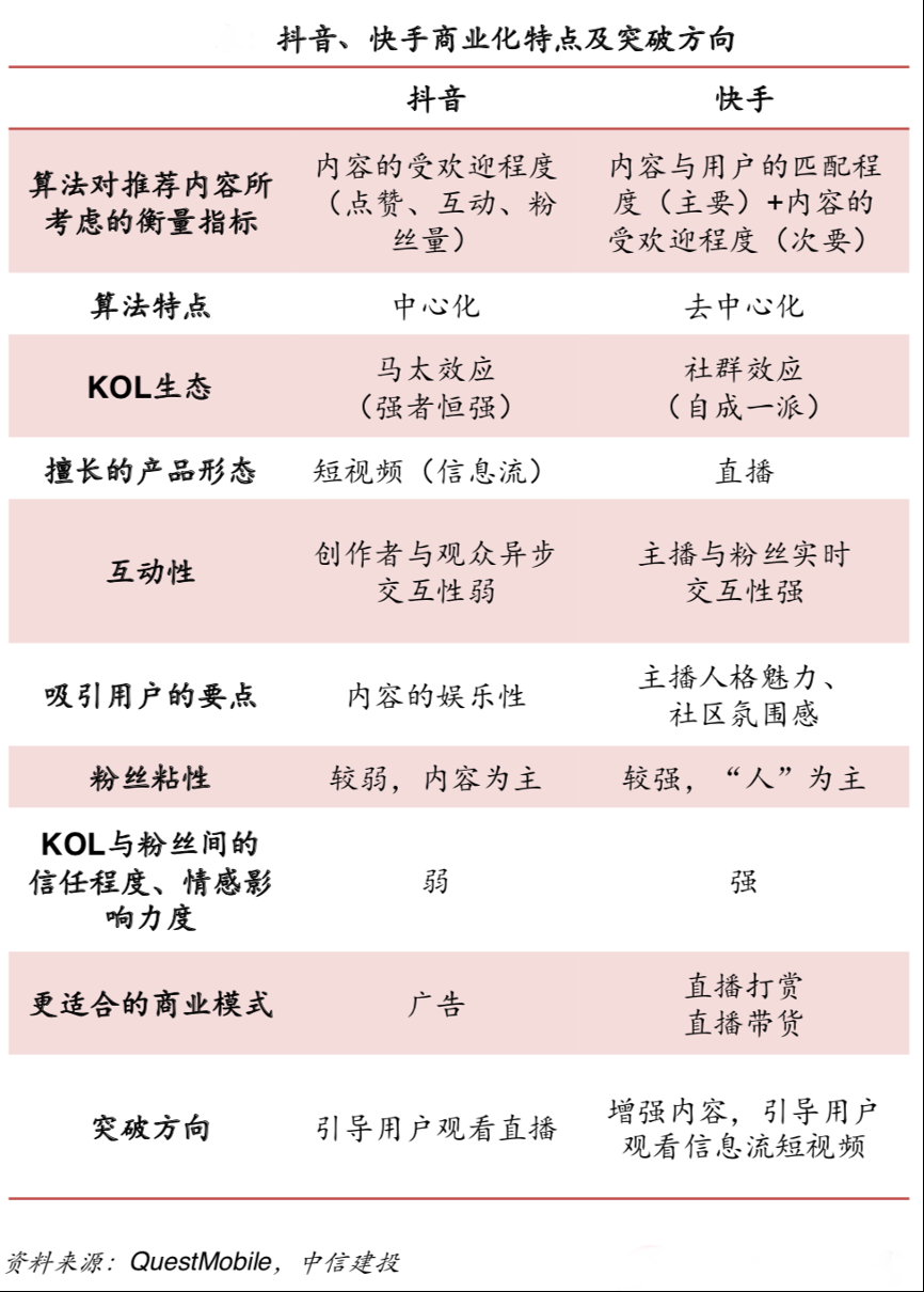 經(jīng)典案例:根據(jù)QuestMobile、中信建投等綜合資訊表明,基于抖音更加中心化與偏媒體的屬性,其商業(yè)模式更適合短視頻信息流下的廣告,而快手去中心化與偏社區(qū)的屬性,商業(yè)模式更適合直播,因此抖音、快手收入中,分別以廣告、直播占比更高。同時(shí)根據(jù)QuestMobile,抖音與快手重疊用戶的占比持續(xù)上升,到21年3月,二者重疊用戶分別占快手、抖音用戶數(shù)的58.2%/45%。