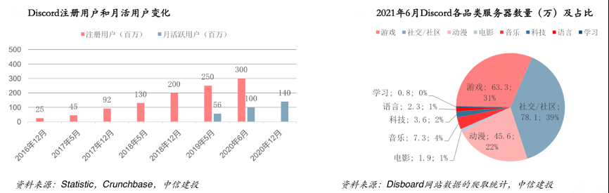 經(jīng)典案例:根據(jù)Statistic、Crunchbase、Discord網(wǎng)站數(shù)據(jù)的爬取統(tǒng)計(jì)、中信建投等綜合資訊表明,Discord早期是一款游戲語音實(shí)時(shí)交流軟件,而后擴(kuò)展成為一個(gè)綜合實(shí)時(shí)興趣社群,提供多領(lǐng)域的實(shí)時(shí)交流服務(wù)。部分廠商不具備自建社群的能力,Discord則可以架設(shè)相關(guān)的游戲社群,例如熱門游戲《Among US》的官方Discord社區(qū)擁有41.3萬用戶。Discord從一款游戲語音實(shí)時(shí)軟件做起,但在 2020年中宣布了全品類的戰(zhàn)略方向,目前在傳統(tǒng)的游戲(31.2%)和動(dòng)漫(22.5%)外已開始向社交/音樂等其他社群擴(kuò)展。
