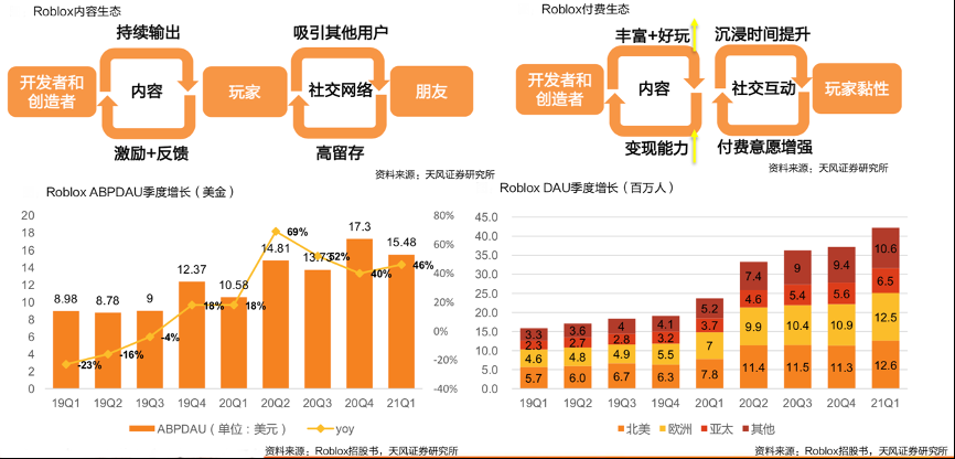 經(jīng)典案例:根據(jù)Roblox招股書(shū)、天風(fēng)證券研究所等綜合資訊表明,Roblox的UGC內(nèi)容生態(tài)+社交屬性構(gòu)筑正向飛輪效應(yīng):越多開(kāi)發(fā)者創(chuàng)造游戲+玩法內(nèi)容,玩家沉浸時(shí)間越長(zhǎng),通過(guò)社交網(wǎng)絡(luò)吸引越 多新用戶;玩家基礎(chǔ)擴(kuò)張的同時(shí),由于UGC的激勵(lì)+反饋經(jīng)濟(jì)系統(tǒng),越多玩家變成開(kāi)發(fā)者,形成正向飛輪效應(yīng)。