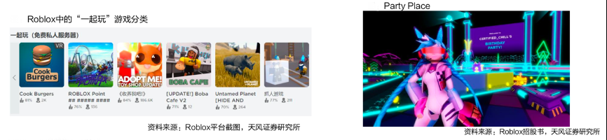 經(jīng)典案例:根據(jù)Roblox平臺(tái)、Roblox招股書(shū)、天風(fēng)證券研究所等綜合資訊表明,不止游戲,Roblox更是個(gè)青少年社交、虛擬生活平臺(tái):玩家能夠在其中聊天,與現(xiàn)實(shí)或虛擬的朋友進(jìn)行互動(dòng);疫情期間還推出了“一起玩”游戲分類,鼓勵(lì)玩家進(jìn)行線上游戲的同時(shí)社交;推出的“party place”功能可供玩家在虛擬世界中舉辦生日派對(duì)和其他聚會(huì),舉辦虛擬演唱會(huì)等。