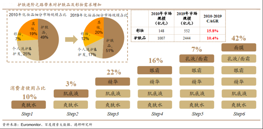 經(jīng)典案例:根據(jù)Euromonitor、百度搜索大數(shù)據(jù)、德邦研究所等綜合資訊表明,消費(fèi)者對(duì)護(hù)膚步驟處于不斷進(jìn)階、學(xué)習(xí)過(guò)程中,當(dāng)前已經(jīng)有42%的消費(fèi)者護(hù)膚通過(guò)爽膚水→肌底液→精華→眼霜→乳液/面霜→面膜六個(gè)步驟完成,護(hù)膚步驟逐漸進(jìn)階帶來(lái)對(duì)面膜、精華、眼霜的關(guān)注增加,同時(shí)彩妝及護(hù)膚品行業(yè) 2019 年規(guī)模分別為 552 億、2444 億,對(duì)應(yīng) 2010-2019 年 CAGR 為 15.8%、10.4%,占行業(yè)比重為 12%/+5pct、51%/+2pct。 精細(xì)護(hù)膚及彩妝產(chǎn)品將帶動(dòng)化妝品行業(yè)維持高增長(zhǎng)。