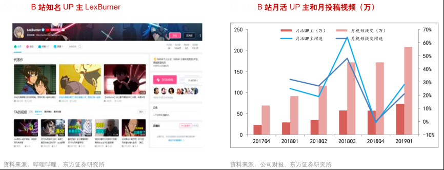 經(jīng)典案例:根據(jù)嗶嗶哩哩、公司財報、東方證券研究所等綜合資訊表明,創(chuàng)作是 Z 世代自我表達(dá)、實現(xiàn)個體價值重要方式,他們將創(chuàng)作發(fā)展為自身職 業(yè),也迅速成為了流行文化的主要影響者和制造者。截至 2019 年Q1,Bilibili 的月均活躍 UP 主(指在上傳視頻或音頻文件的創(chuàng)作者)為 73.2 萬,同比增長 150%。這些活躍在各個興趣區(qū)的 UP 主們 不僅用自己創(chuàng)作的高質(zhì)量內(nèi)容吸引了不少中國年輕人的關(guān)注和喜愛,更是 B 站從小眾的 ACG 社區(qū)發(fā)展成為 UGC 為核心的上市企業(yè)的最佳見證者。