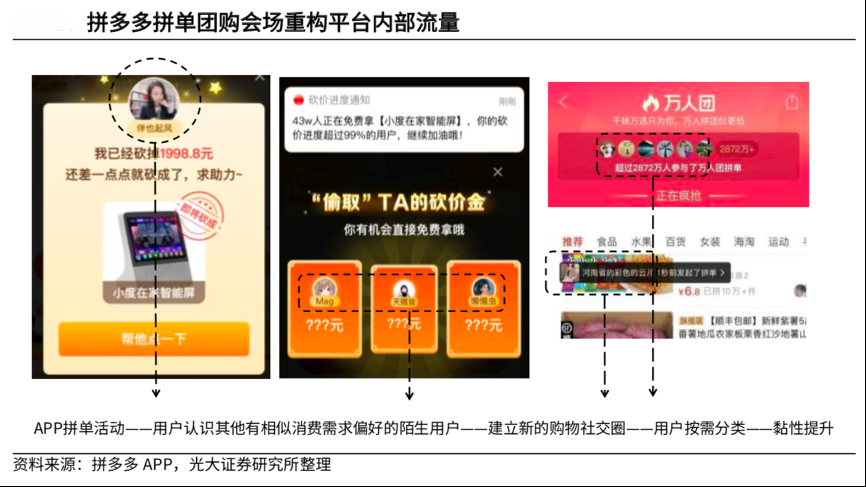 經(jīng)典案例:根據(jù)拼多多APP、光大證券研究所等綜合資訊表明,拼多多通過(guò)拼單團(tuán)購(gòu)會(huì)場(chǎng)重構(gòu)平臺(tái)內(nèi)部流量,將原有用戶流量按需再分類,通過(guò)拼單、萬(wàn)人團(tuán)等活動(dòng)引導(dǎo)用戶在購(gòu)物時(shí)社交,從而形成具有相似購(gòu)物需求和偏好的社交圈。拼多多用戶流量池在一定程度上自發(fā)按需分類,為拼多多的 C2M 體系打造奠定底層基礎(chǔ)。
