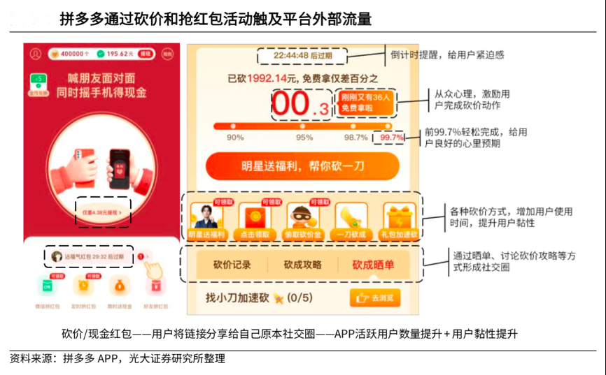 經(jīng)典案例:根據(jù)拼多多APP、光大證券研究所等綜合資訊表明,拼多多通過(guò)砍價(jià)和搶紅包活動(dòng)觸達(dá)用戶社交圈流量,引流至拼多多平臺(tái)內(nèi)。其通過(guò)推出朋友砍價(jià)和搶現(xiàn)金紅包等活動(dòng),引導(dǎo)用戶將鏈接發(fā)給朋友,獲得更多新用戶。拼多多的砍價(jià)和搶紅包的首次參與難度很低,“砍第一刀”便可以獲得大部分折價(jià),用戶形成良好的心里預(yù)期,將繼續(xù)參與砍價(jià)。