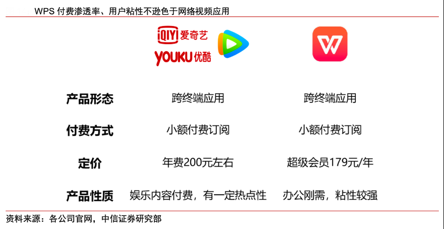 經(jīng)典案例:根據(jù)各公司官網(wǎng)、中信證券研究部等綜合資訊表明,WPS目前正通過(guò)產(chǎn)品服務(wù)體驗(yàn)、中長(zhǎng)期付費(fèi)引導(dǎo)等方式,促進(jìn)用戶從“為功能付費(fèi)”轉(zhuǎn)向“為服務(wù)付費(fèi)”,云服務(wù)可以進(jìn)一步提升跨終端應(yīng)用的用戶體驗(yàn)及使用粘性,培養(yǎng)用戶長(zhǎng)期付費(fèi)使用習(xí)慣。整體看,WPS 的付費(fèi)滲透率和用戶粘性應(yīng)不遜色于網(wǎng)絡(luò)視頻應(yīng)用,其核心用戶群的長(zhǎng)期付費(fèi)轉(zhuǎn)化率有更大空間。