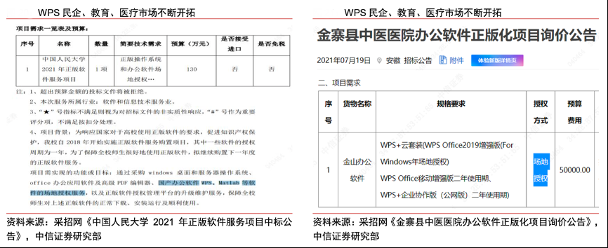 經(jīng)典案例:根據(jù)采招網(wǎng)、中信證券研究部等綜合資訊表明,此前金山辦公公司授權(quán)業(yè)務(wù)主要專(zhuān)注于黨政、央企、國(guó)企市場(chǎng),在微軟相對(duì)強(qiáng)勢(shì)的民企市場(chǎng)并未重點(diǎn)開(kāi)拓。根據(jù)公司渠道合作伙伴大會(huì)披露信息,2021年以來(lái)金山公司渠道超過(guò) 2000 家。2021年中報(bào)業(yè)績(jī)交流會(huì)上公司表示目前正在積極推進(jìn)民企、教育、醫(yī)療等市場(chǎng)的銷(xiāo)售,擴(kuò)大市場(chǎng)覆蓋范圍,有望在明年迎來(lái)增量收入,相關(guān)領(lǐng)域開(kāi)拓進(jìn)展參考采招網(wǎng)上訂單信息有所印證。