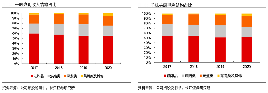 經(jīng)典案例:根據(jù)公司招股說明書、長江證券研究所等綜合資訊表明,千味央廚的油炸類產(chǎn)品占比逐步下降,品類逐步豐富。分產(chǎn)品類型來看,油炸類產(chǎn)品是公司的主力 產(chǎn)品,2020年油炸品/烘焙類/蒸煮類/菜肴類及其他的收入占比分別約為 55%/20%/19%/5%,毛利率分別為 20.2%/22.9%/24.6%/19.3%,毛利占比分別約為52%/21%/22%/5%。而從 2017-2020 年各產(chǎn)品占比的變化來看,油炸類產(chǎn)品的收入占比逐步下降,千味央廚的產(chǎn)品品類更為豐富。