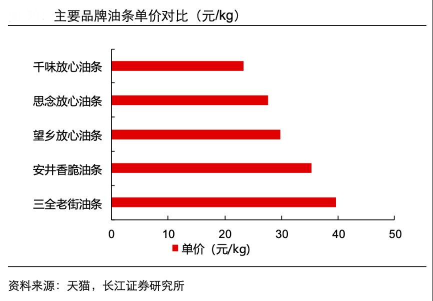 經(jīng)典案例:根據(jù)天貓、長江證券研究所等綜合資訊表明,傳統(tǒng)油條多為路邊攤現(xiàn)做現(xiàn)炸,不僅耗時(shí)耗力,同時(shí)質(zhì)量與風(fēng)味不穩(wěn)定,使用地溝油、多次復(fù)炸以及明礬使用過量等食品安全問題 常見諸報(bào)端。針對這些問題,千味央廚率先切入工業(yè)油條領(lǐng)域,于 2006 年推出千味央廚安心油條,開創(chuàng)中國工業(yè)油條品牌。目前油條為千味央廚的核心單品之一,2020年其 KFC 冷凍油條、香脆油條、放心大油條三款油條產(chǎn)品實(shí)現(xiàn)銷售額 1.36 億元。