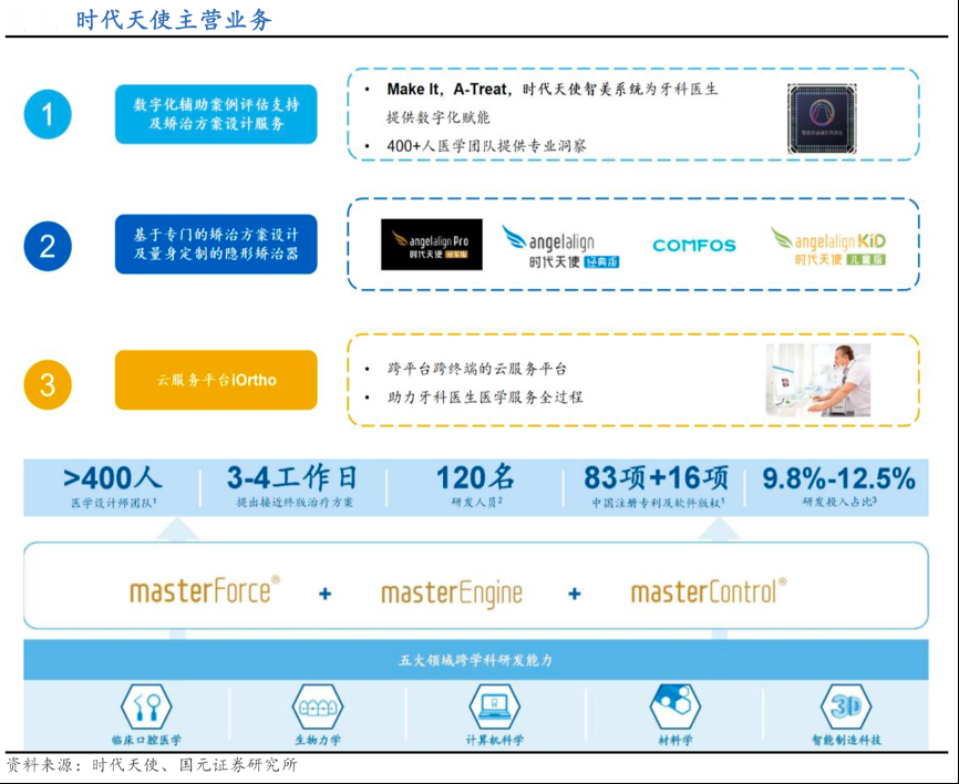 經(jīng)典案例:根據(jù)時代天使、國元證券研究所等綜合資訊表明,時代天使是口腔隱形正畸技術(shù)、隱形矯治器生產(chǎn)及銷售的服務(wù)提供商,主營業(yè)務(wù)主要由三個階段組成:(1)數(shù)字化輔助案例評估支持及矯治方案設(shè)計服務(wù);(2)基于專門的矯治方案生產(chǎn)定制且可拆裝的隱形矯治器;(3)云服務(wù)平臺,可協(xié)助牙科醫(yī)生為患者提供全面、高效且有效的正畸治療。