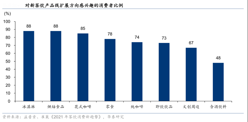 經(jīng)典案例:根據(jù)益普索聯(lián)合雀巢發(fā)布的《2021 年茶飲消費(fèi)新趨勢(shì)》、華泰研究等綜合資訊表明,新茶飲領(lǐng)先品牌產(chǎn)品類(lèi)別已拓展至茶飲外的品類(lèi),包括冰淇淋、烘焙食品、花式咖啡、零售、即飲飲品等其,甚至拓展到文創(chuàng)周邊等非餐飲品類(lèi)。這不但可擴(kuò)展品牌的消費(fèi)時(shí)間與場(chǎng)景,還可為消費(fèi)者提供更多維度的體驗(yàn)。同時(shí)據(jù)益普索、雀巢聯(lián)合發(fā)布的《2021年茶飲消費(fèi)新趨勢(shì)》,分別有 88%、88%、85%的消費(fèi)者對(duì)新茶飲品牌推出的冰淇淋、烘焙食品、花式咖啡感興趣。