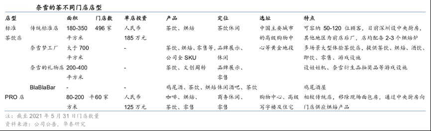 經(jīng)典案例:根據(jù)公司公告、華泰研究等綜合資訊表明,奈雪的茶包括 5 種門(mén)店類(lèi)型,除傳統(tǒng)標(biāo)準(zhǔn)店外,還包括奈雪的禮物店(茶飲+文創(chuàng))、奈雪夢(mèng)工廠(品牌展示+研發(fā))、奈雪酒屋BlaBlaBar (茶飲+酒吧)、奈雪PRO店(茶飲+咖啡)。多元的店型覆蓋了下午茶、酒吧、休閑、商務(wù) 等場(chǎng)景,為消費(fèi)提供全方位的社交空間。